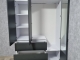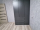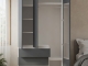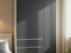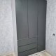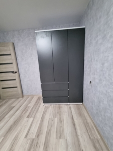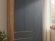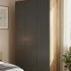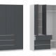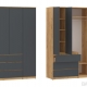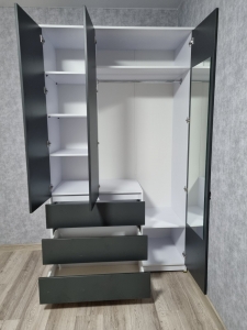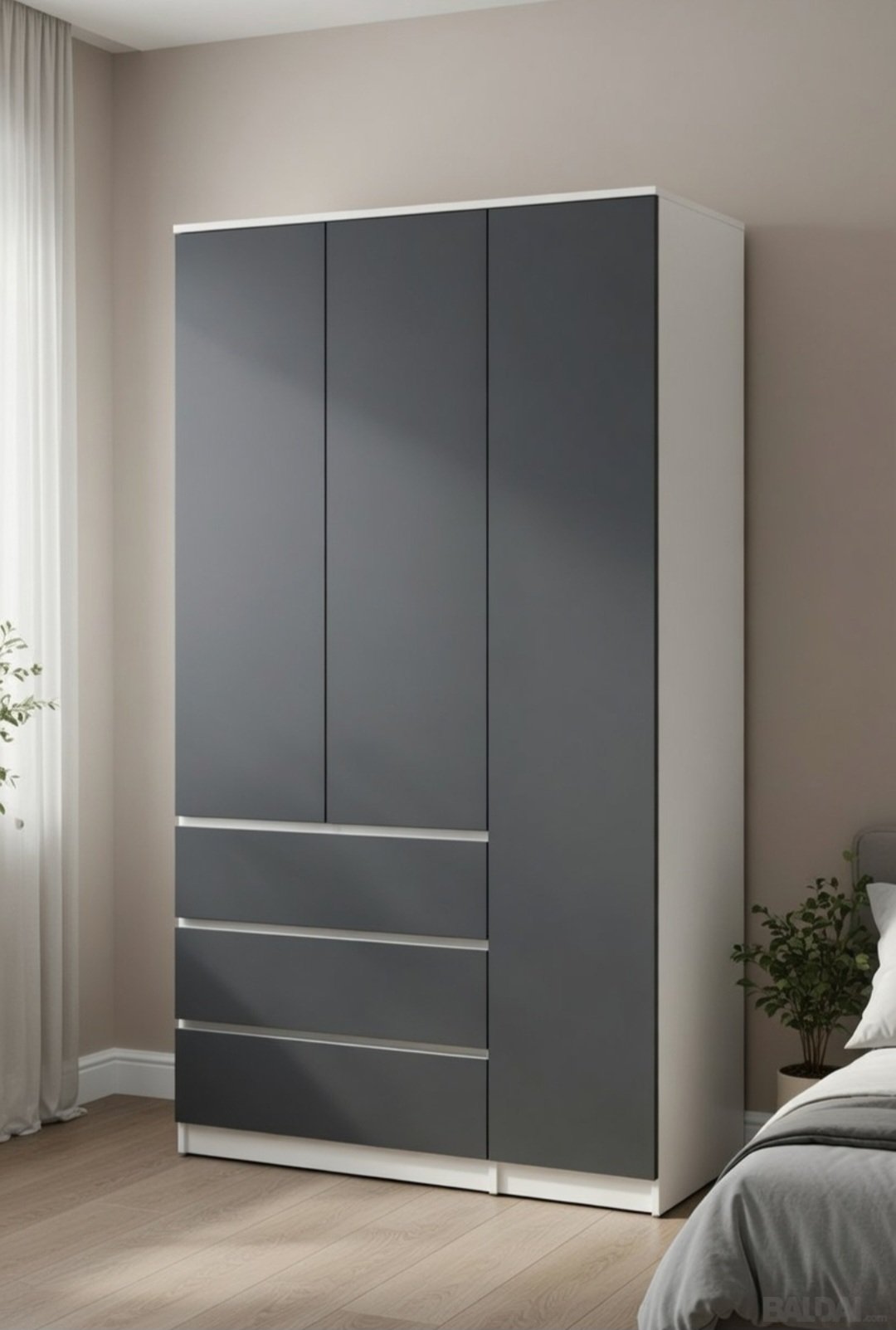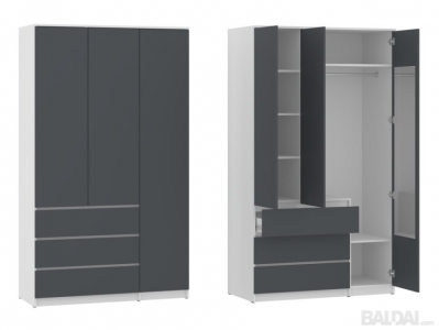 Trijų durų spinta su veidrodžiu ir stalčiais.